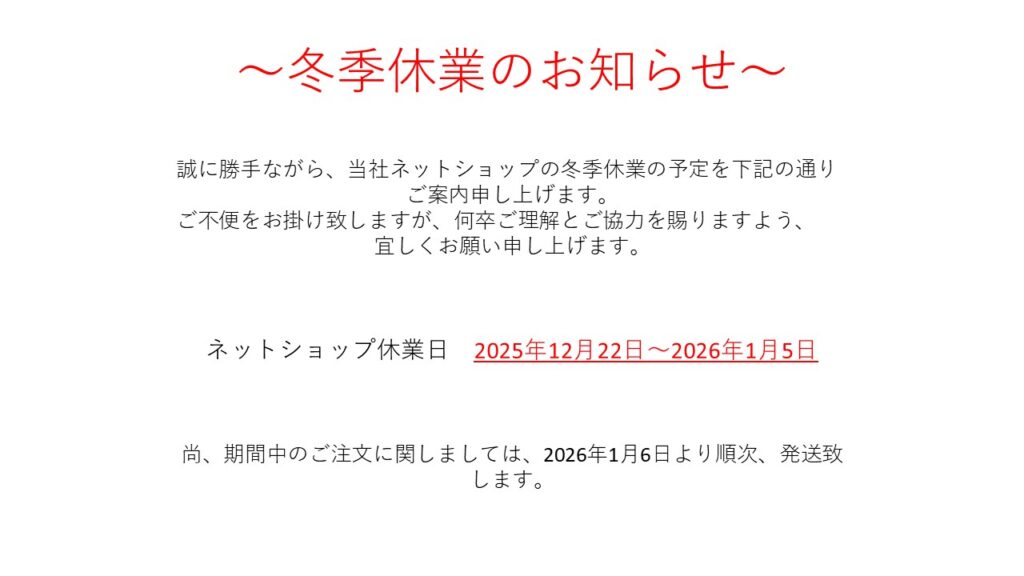 誠に勝手ながら、当社ネットショップの冬季休業の予定を下記の通り ご案内申し上げます。 ネットショップ休業日: 2024年12月22日~2025年1月5日 ご不便をお掛け致しますが、何卒ご理解とご...